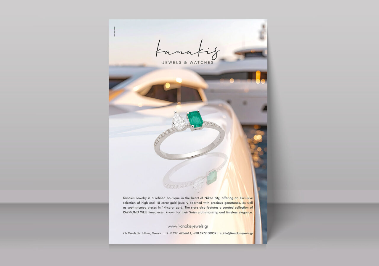 Το συγκεκριμένο project αφορά τον σχεδιασμό εταιρικής διαφημιστικής καταχώρησης για το κοσμηματοπωλείο Kanakis Jewels & Watches, με στόχο την ανάδειξη της πολυτέλειας, της υψηλής αισθητικής και της διαχρονικής κομψότητας που χαρακτηρίζουν το brand. Η δημιουργική προσέγγιση βασίστηκε στη σύνδεση του εκλεπτυσμένου κοσμήματος με ένα lifestyle πολυτελείας, επιλέγοντας ως φόντο ένα εντυπωσιακό θαλάσσιο σκηνικό με yacht, που αποπνέει exclusivity και prestige.